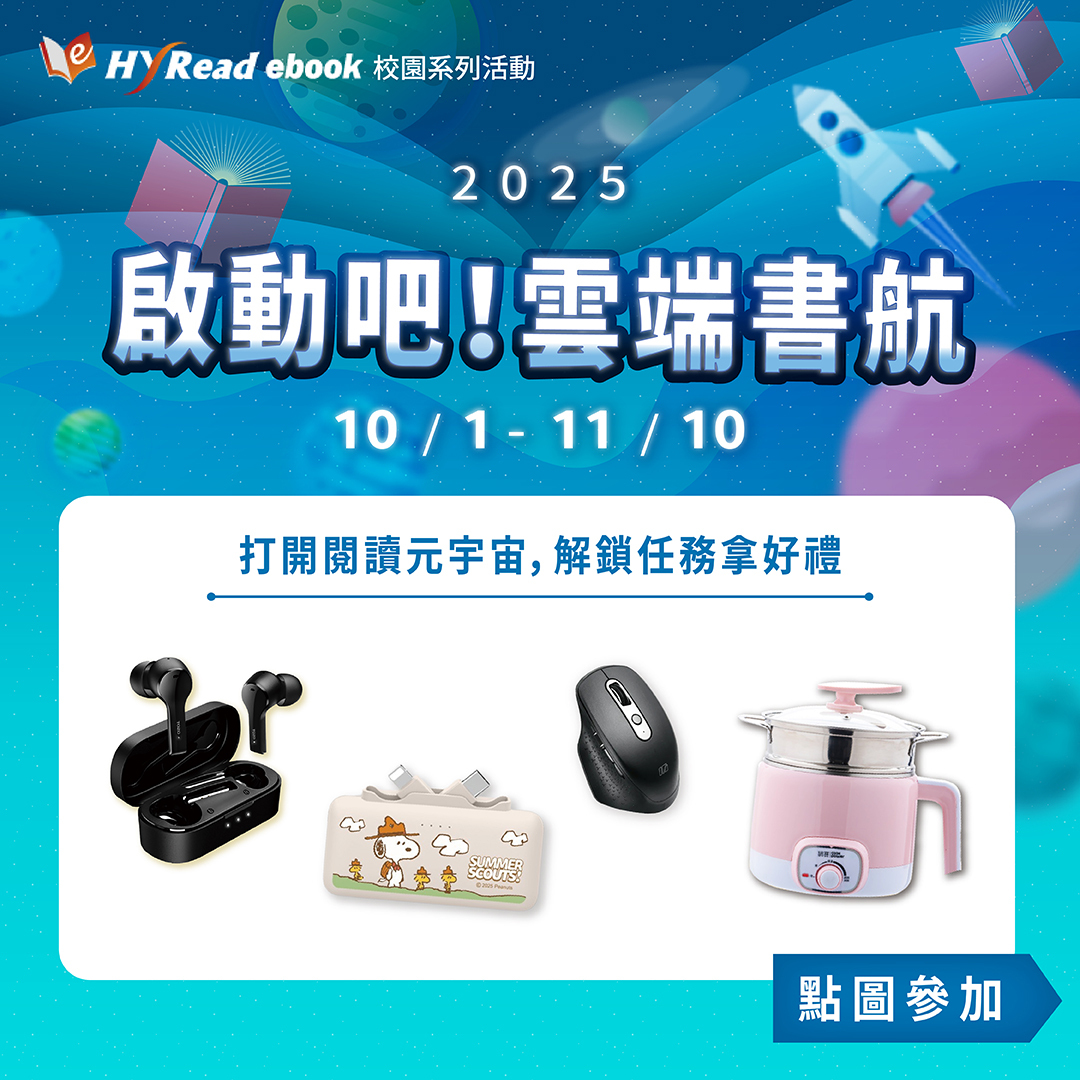 📚 大專院校師生限定,只要在活動期間完成簡單的電子書借閱任務,就有機會參加抽獎!多看一本書,就多一次中獎機會!還等什麼?快來加入我們的「雲端書航」,一起享受閱讀的樂趣,把大獎帶回家!