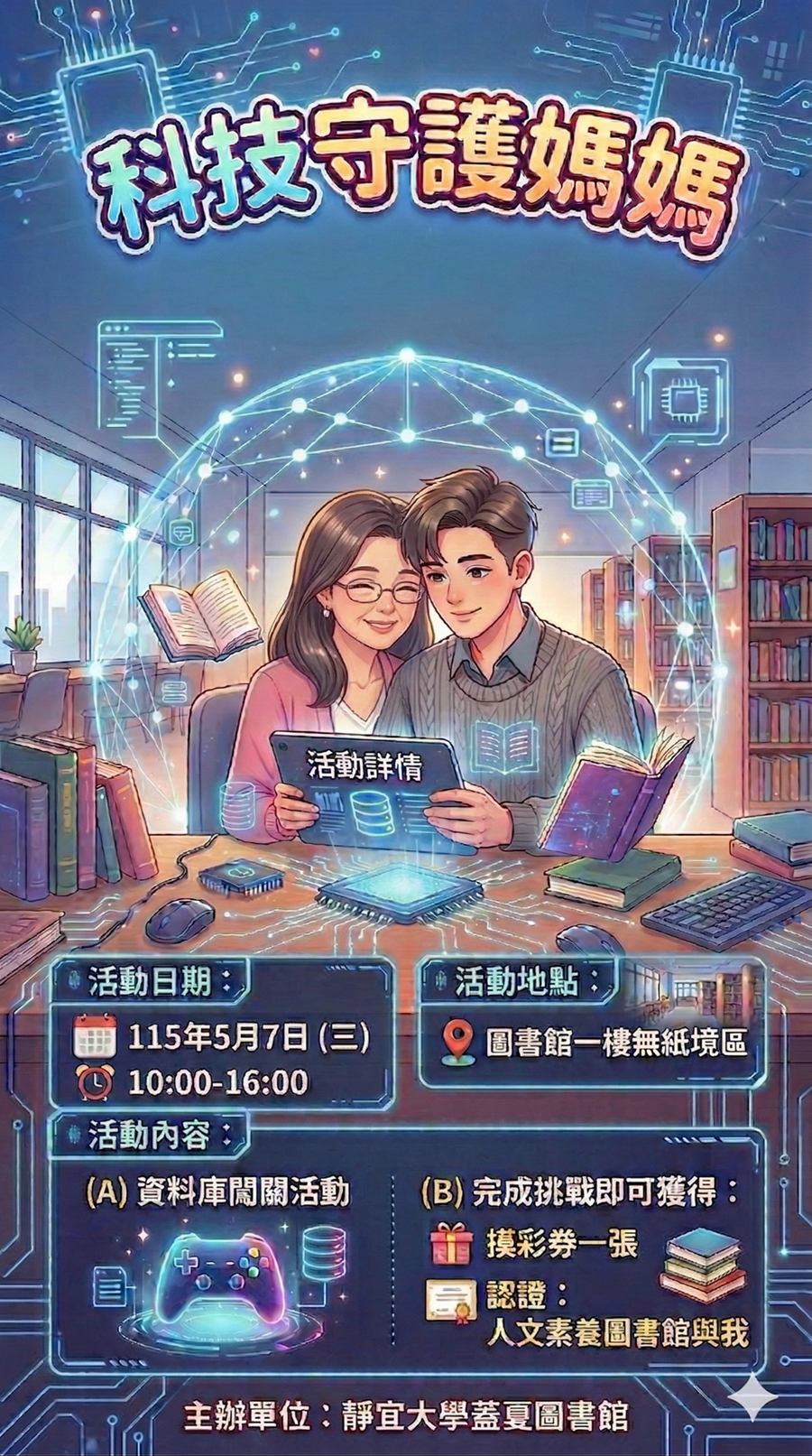 5/7日邀請你走進圖書館的數位世界, 透過最新的科技研究與電子資源, 一起探索如何用「智慧生活」與「健康科技」, 為媽媽打造更安心、便利的每一天。讓我們用閱讀,為愛多做一點準備。