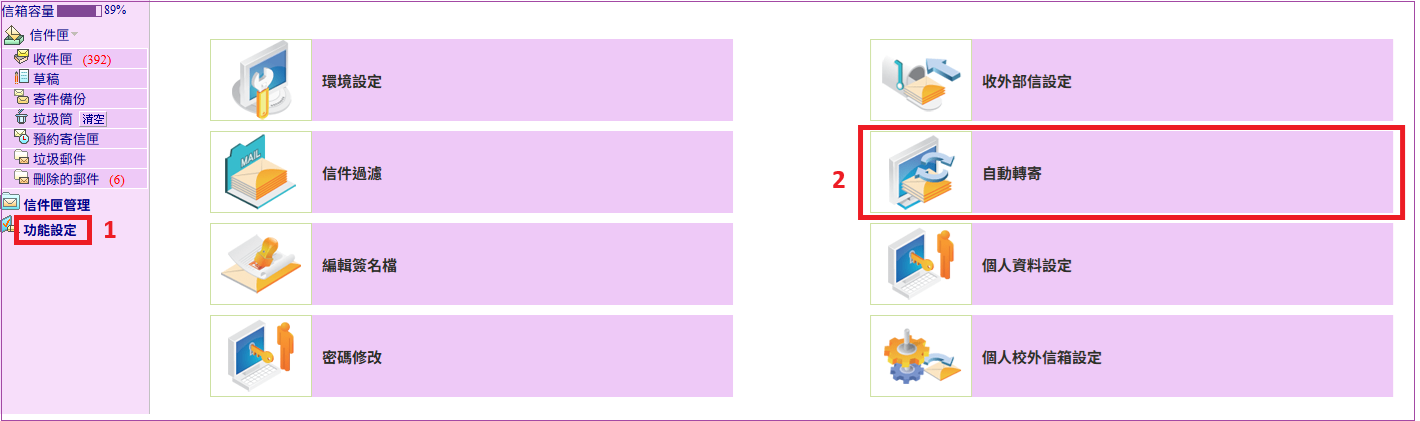 用e校園帳密登入https://webmail.pu.edu.tw 後,「功能設定 > 自動轉寄 >自動轉寄 V 保留原始信件」