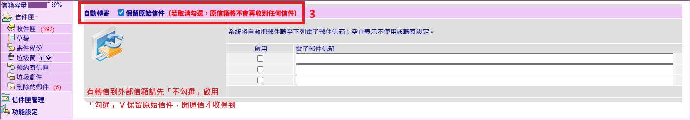 若有轉信至其他信箱,請先「不勾選」啟用該信箱