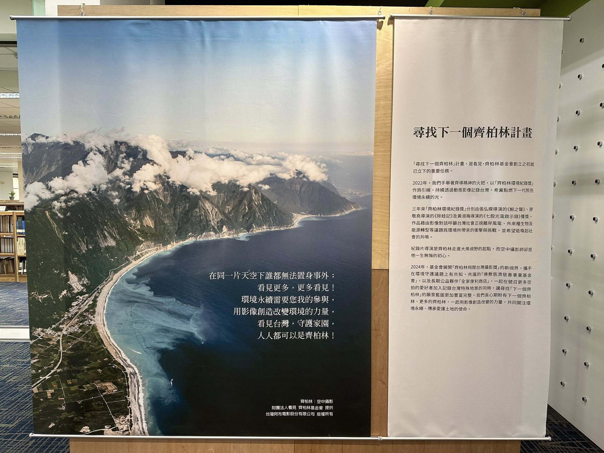 靜宜大學圖書館很榮幸與「看見。齊柏林基金會、佛教慈濟慈善事業基金會、全家便利商店」合辦「2024齊柏林飛閱台灣攝影獎-公益巡迴攝影展」,期盼透過空拍影像展覽,促進民眾對土地、對環境多一分的關懷。